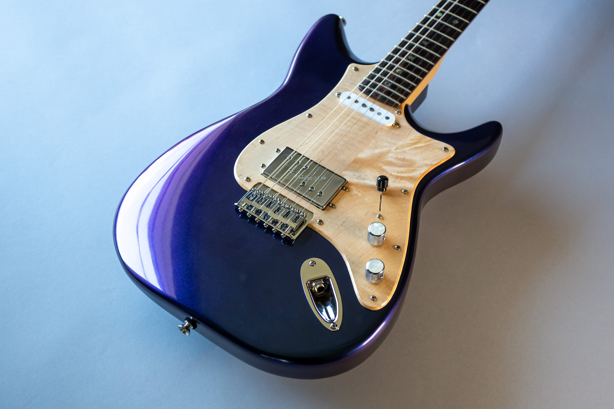 This is a custom profile solid body proportioned to a Tele but with Strat style front and back contours, contoured cutaways, and Les Paul sound thanks to dual PAF humbuckers. It is a laminate of maple, birch, cherry, and black walnut finished with nitro, a CBS neck, hard tail bridge, standard Tele controls, and a walnut pickguard.